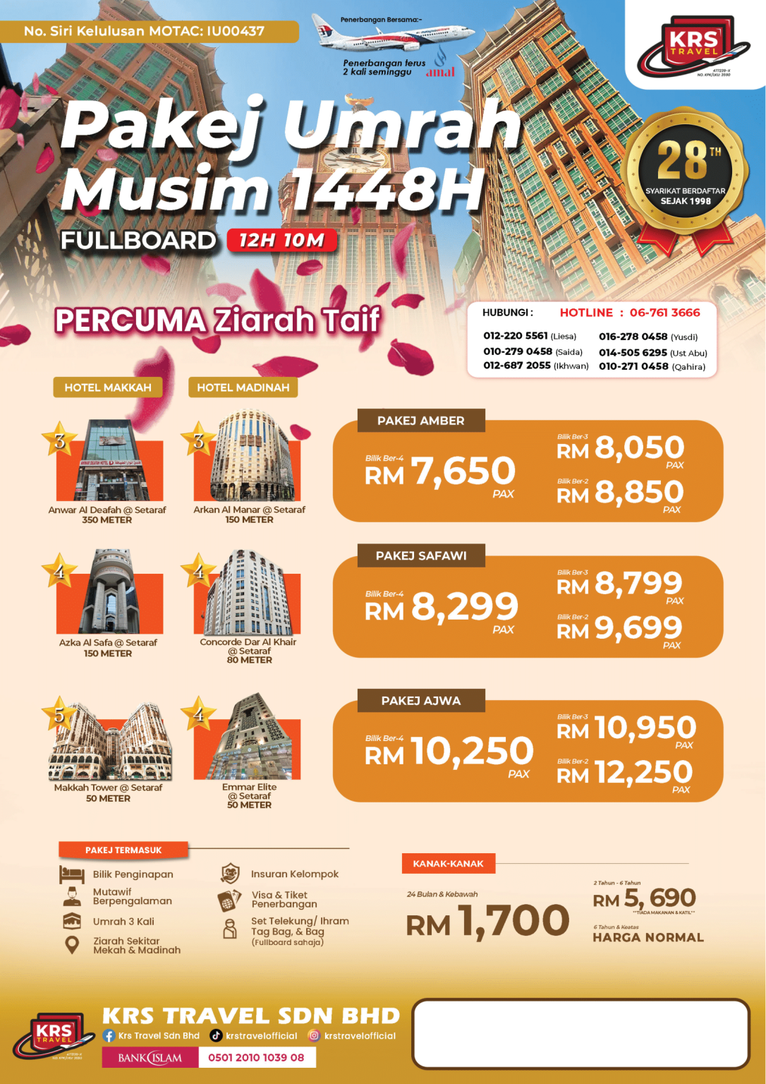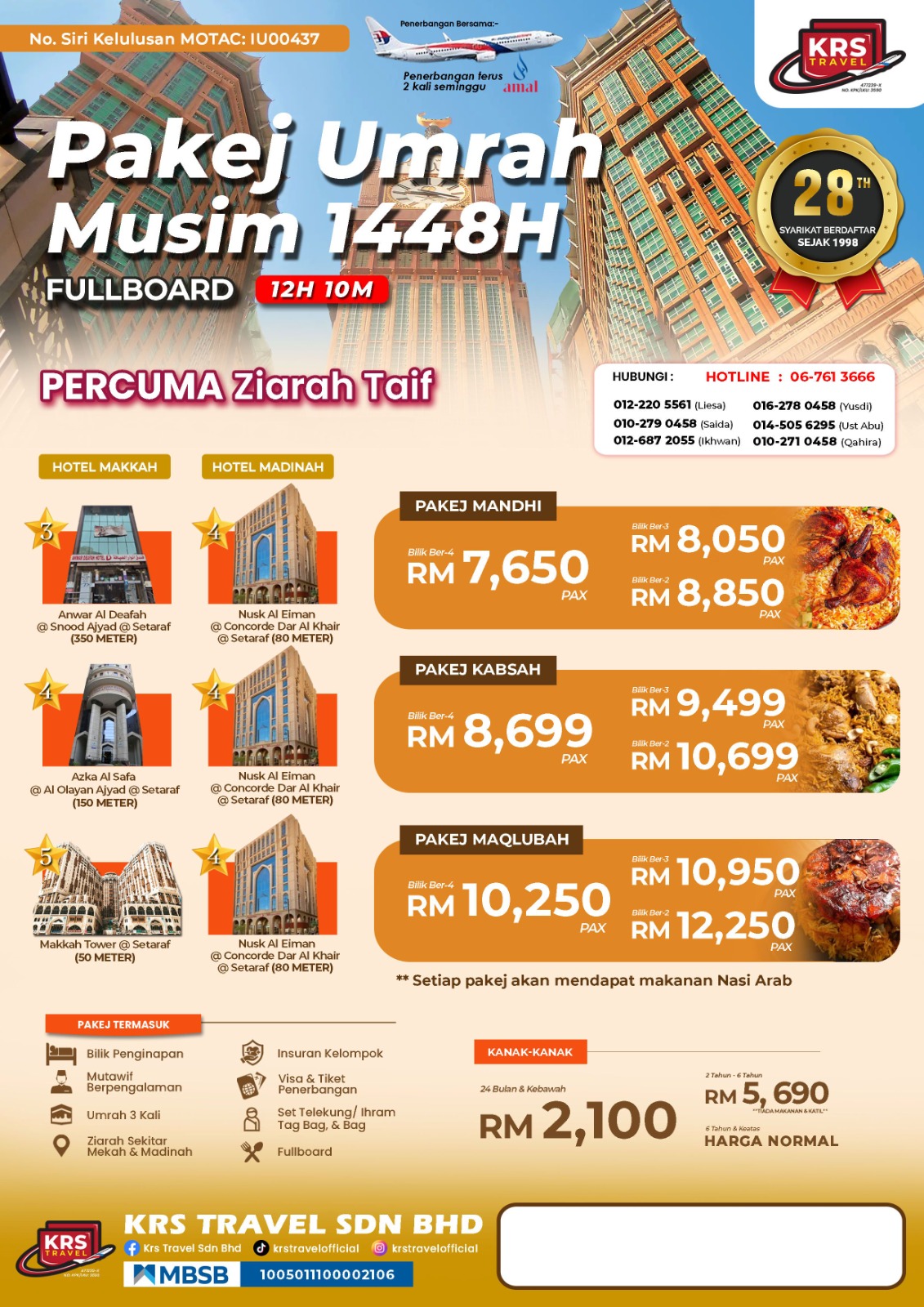 Maklumat terperinci Pakej-pakej Umrah 1448H/2026 & 27 yang ditawarkan oleh KRS Travel Sdn Bhd.