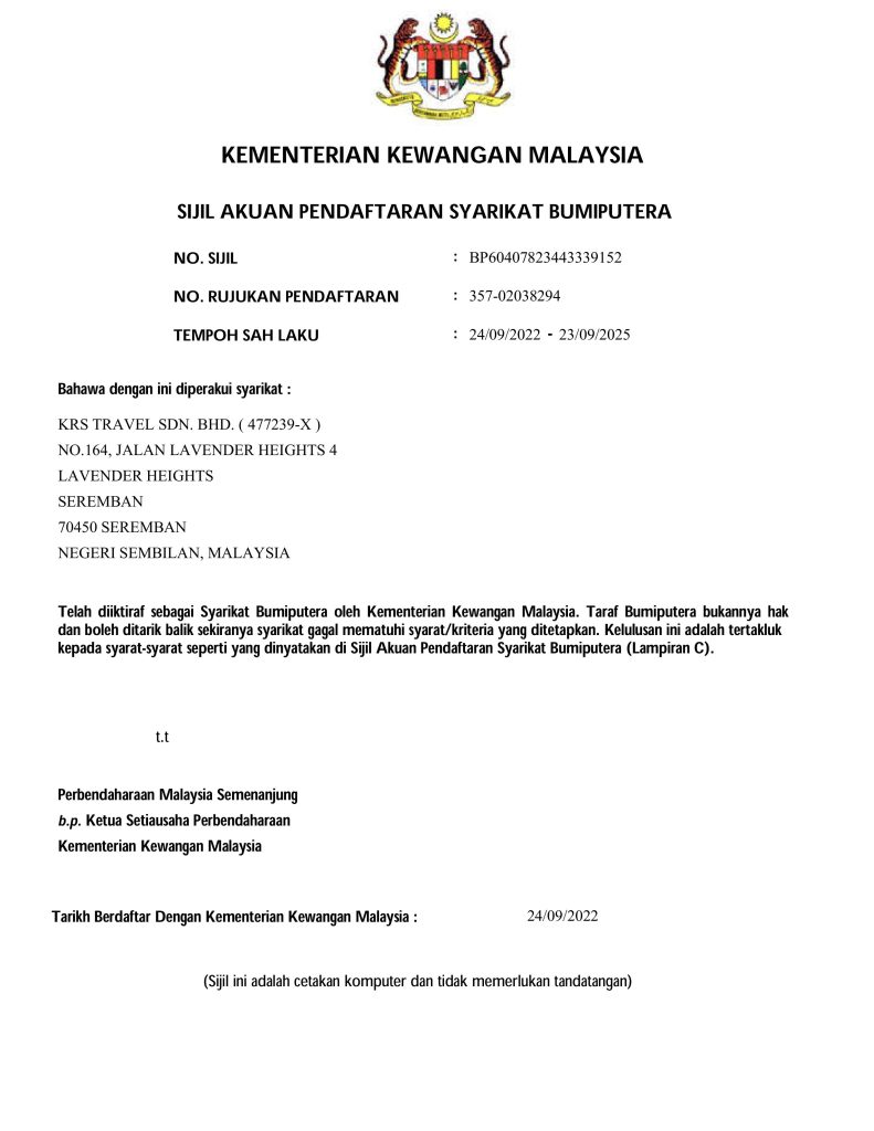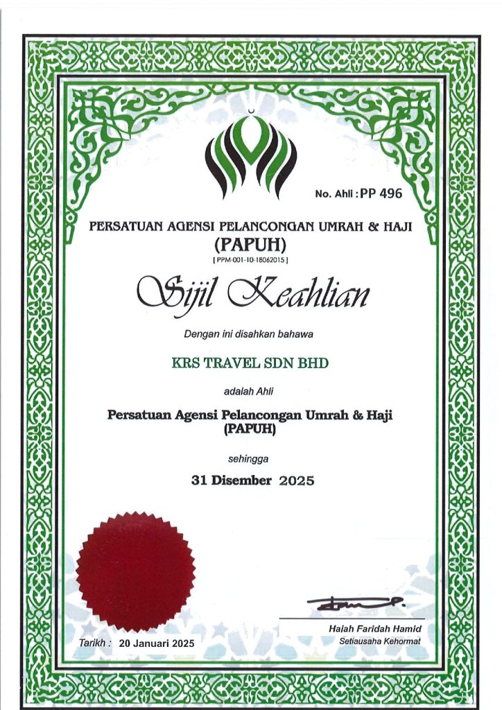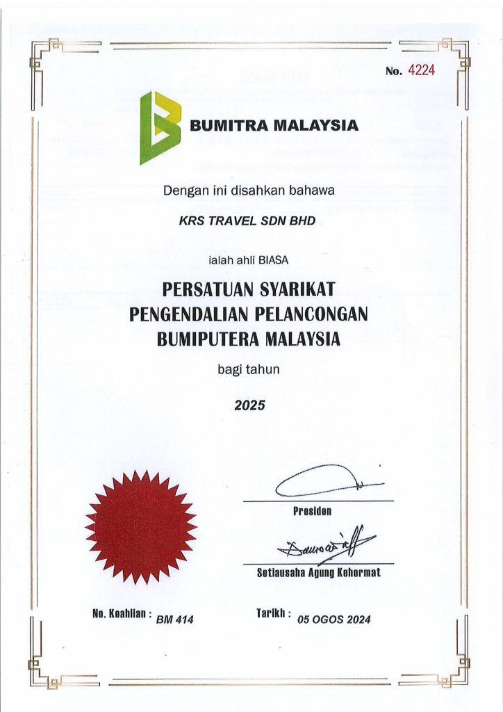 KRS Travel Sdn Bhd merupakan sebuah syarikat milik penuh Bumiputera yang ditubuhkan dan diperbadankan pada 12 Februari 1999 (No. 477239-X), serta berlesen di bawah Kementerian Pelancongan Malaysia (No. Lesen KPL 3590). Sejak lebih 27 tahun lalu, KRS Travel berdedikasi membantu umat Islam menunaikan ibadah Umrah dan Haji dengan tenang, selesa, dan penuh bimbingan. Sepanjang tempoh tersebut, kami telah menguruskan lebih 217,000 jemaah dari seluruh Malaysia, menjadikan KRS Travel antara agensi yang paling dipercayai dalam industri.