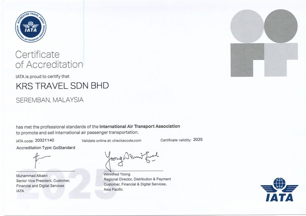 Selain menyediakan Pakej Umrah, Haji, Visa, dan Tiket, KRS Travel juga menawarkan pelbagai pakej pelancongan domestik dan antarabangsa. Kami merupakan syarikat berdaftar dengan Kementerian Kewangan (MOF), Persatuan Pengangkutan Udara Antarabangsa (IATA), Persatuan Francais Malaysia (MFA), serta beberapa agensi kerajaan dan swasta. KRS Travel juga berdaftar di bawah Persatuan Ejen-Ejen Pelancongan (Associations of Travel Agents), Pengembaraan Bumiputera Malaysia (BUMITRA), Persatuan Agensi Umrah dan Haji (PAPUH), serta Abacus Distribution System (M) Sdn. Bhd.