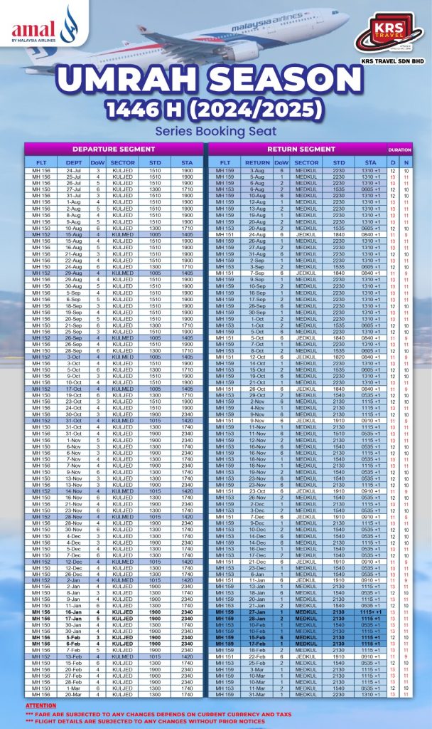 Dapatkan segera tiket penerbangan Umrah anda untuk Musim 1446H (2024/2025) sekarang.